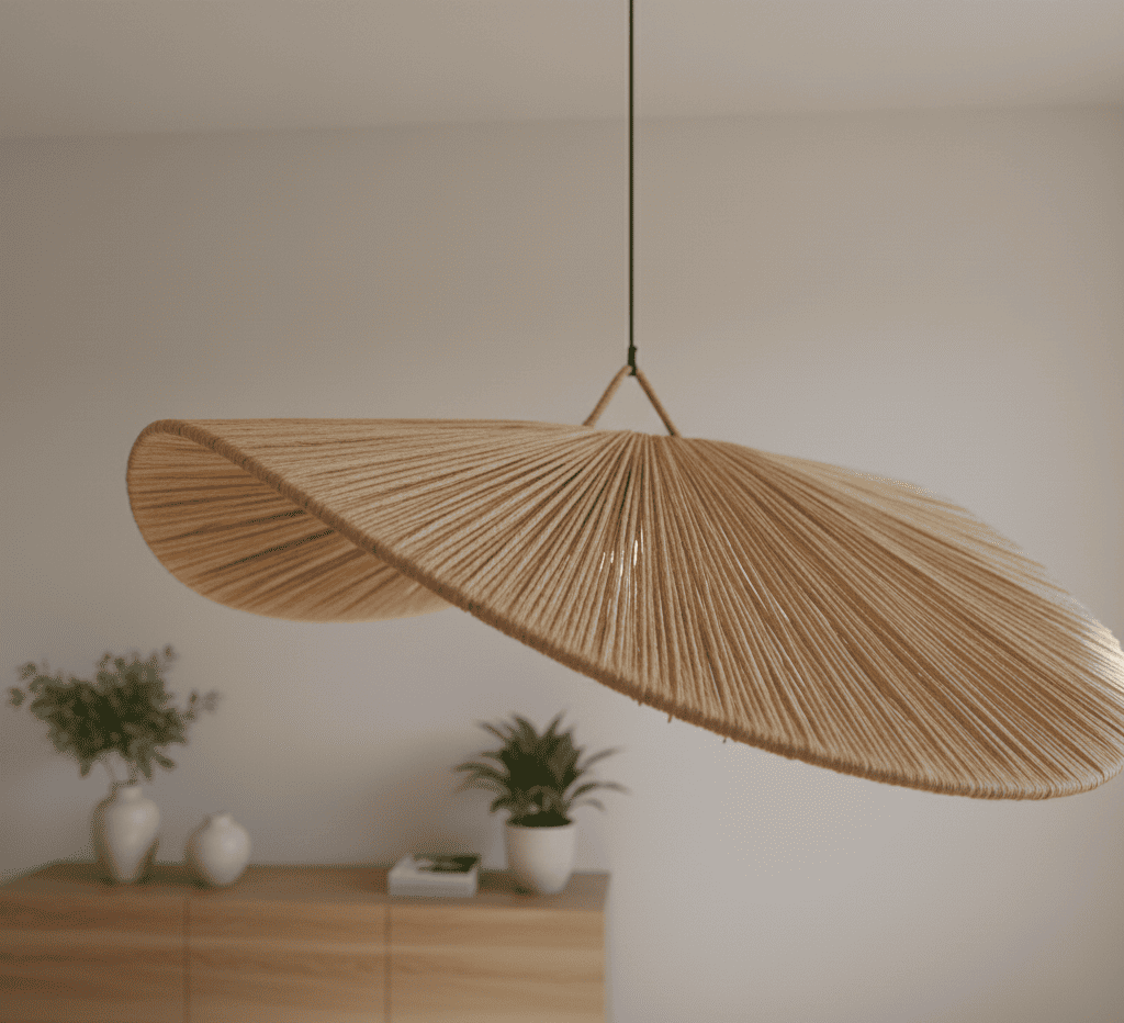 Lámpara de Raffia Natural «Onda Zen» – Iluminación Colgante Minimalista y Sostenible